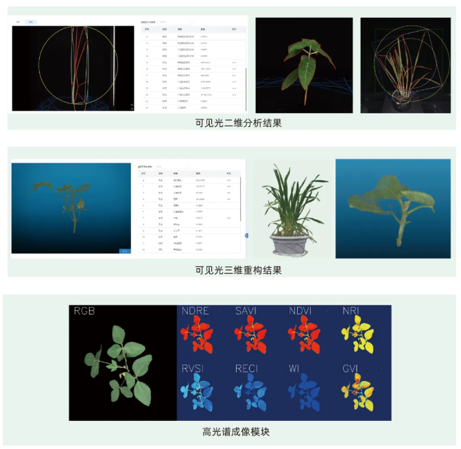 在硬件層面,托普云農(nóng)高度整合可見光二維三維、高光譜、多光譜、紅外熱成像、激光雷達(dá)等先進(jìn)成像技術(shù),以及環(huán)境監(jiān)測、自動稱重等多種高精度傳感器,實現(xiàn)針對糧食作物、經(jīng)濟(jì)作物等不同類型植物的形態(tài)、顏色、紋理、長勢、組分含量等上百種表型指標(biāo)的規(guī)范化表征,并支持針對特定作物、特定表型指標(biāo)進(jìn)行定制化開發(fā)及優(yōu)化,滿足多樣化需求。