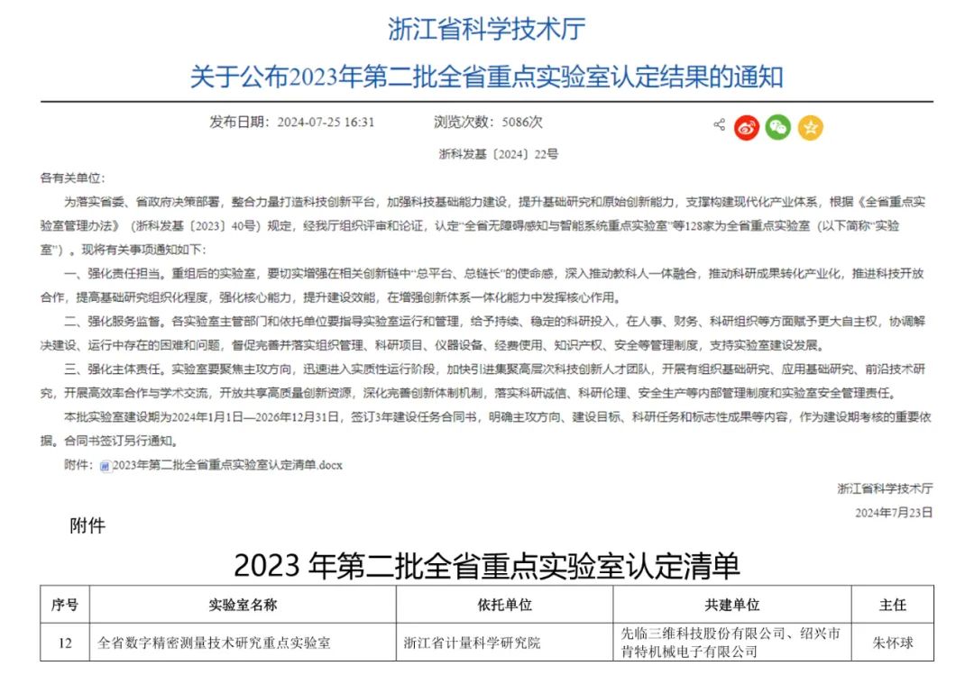近日,由浙江省質量科學研究院牽頭,先臨三維科技股份有限公司參與共建的全省數字精密測量技術研究重點實驗室被浙江省科學技術廳認定為浙江省2023年第二批全省重點實驗室。