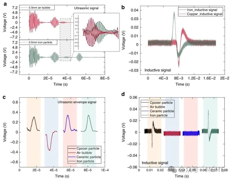 綜上所述,這項(xiàng)研究提出了一種集成超聲單元和電磁感應(yīng)單元的傳感方法,用于實(shí)時(shí)檢測管道內(nèi)的各種污染物和流速。超聲波單元包括一個(gè)通過微機(jī)械技術(shù)制備的柔性換能器貼片,不僅便于安裝,還能聚焦聲場。此外,電磁傳感單元包含三個(gè)對(duì)稱分布的電磁線圈。通過對(duì)超聲波和電磁感應(yīng)信號(hào)的綜合分析,該方法可以有效地區(qū)分磁性金屬(如鐵)、非磁性金屬(如銅)、非金屬顆粒(如陶瓷)和氣泡。這種全面的分類幾乎涵蓋了管道中可能存在的所有污染物類型。此外,通過超聲多普勒頻移可以確定流體速度。通過數(shù)學(xué)模型和有限元仿真驗(yàn)證了所提出的檢測原理的有效性。在直徑14 mm的管道內(nèi),研究人員對(duì)各種不同速度的污染物進(jìn)行了系統(tǒng)地測試。實(shí)驗(yàn)結(jié)果表明,該傳感器能夠有效檢測0.5 ~ 3 mm范圍內(nèi)的污染物,準(zhǔn)確區(qū)分污染物類型,并測量其流速。這項(xiàng)研究的影響可以擴(kuò)展到工業(yè)、航空航天和臨床醫(yī)學(xué)等多個(gè)領(lǐng)域,因此具有更廣泛及深遠(yuǎn)的意義。