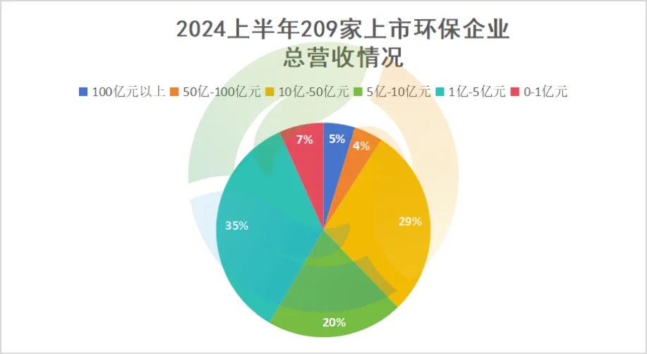 10家環保企業進入總營收百億俱樂部,占比達5%;此外還有9家環保企業總營收處于50-100億元,占比達4%。也就是說,在2024上半年的210家上市環保企業中,9%的環保企業總營收超過50億元。