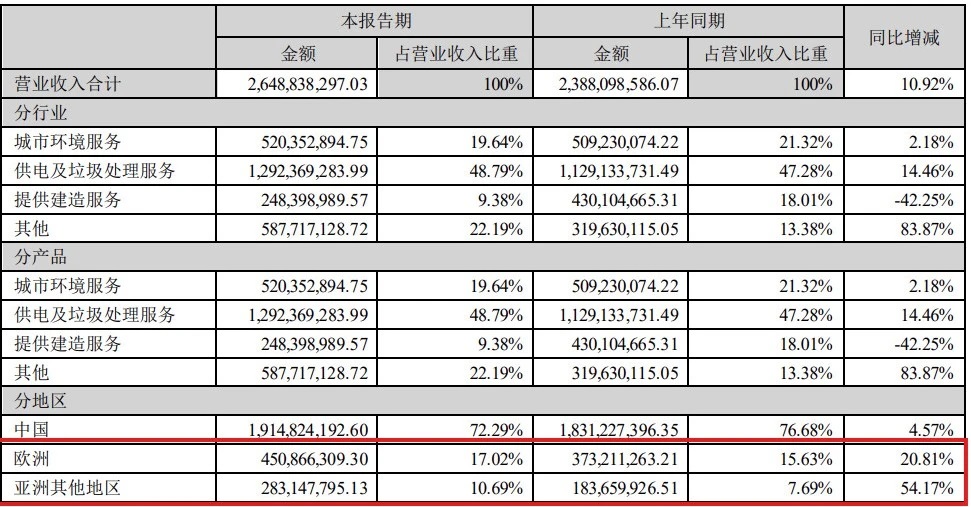 率先布局海外市場的中國環保企業已獲得的成果,也驗證了海外市場是當前非常廣闊的增量空間。根據中國天楹的半年度報告,海外業務占營業收入比重增幅已遠超國內業務,增長潛力值得期待。
