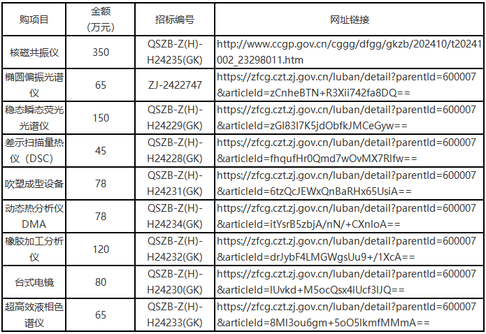 近期,浙江求是招標代理有限公司關于浙江理工大學一批設備發布公開招標公告,本網匯總這批采購項目,該套招標總價超1000萬,涵蓋核磁、光譜、超高效液相色譜、電鏡、量熱儀DSC、動態熱分析儀DMA等設備。詳見下表: