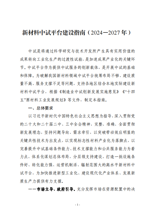 現(xiàn)將《新材料中試平臺建設(shè)指南(2024—2027年)》印發(fā)給你們,請結(jié)合實際認(rèn)真抓好落實。