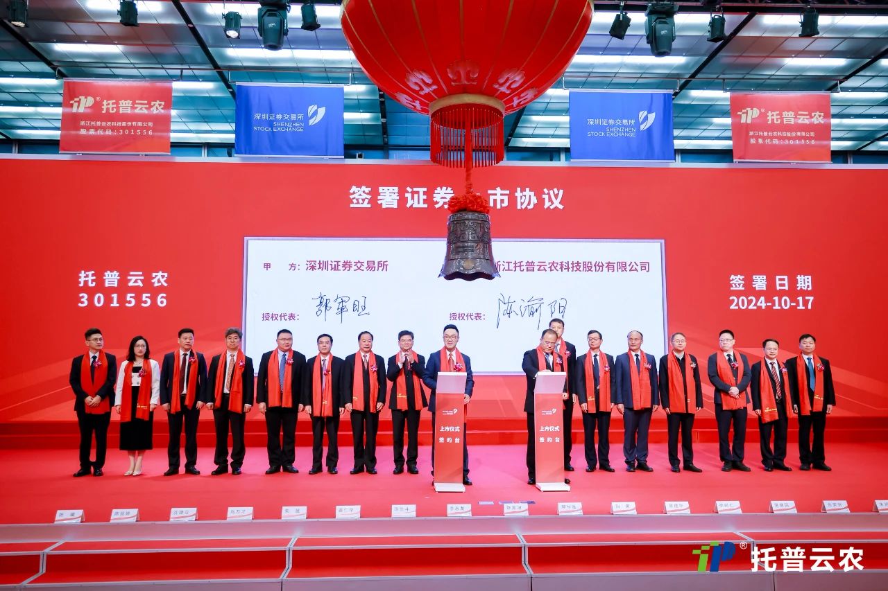 20241017日,隨著深圳證券交易所儀式大廳的鐘聲響起,浙江托普云農(nóng)科技股份有限公司(股票簡(jiǎn)稱:托普云農(nóng),股票代碼:301556)正式在深交所創(chuàng)業(yè)板鳴鐘上市!