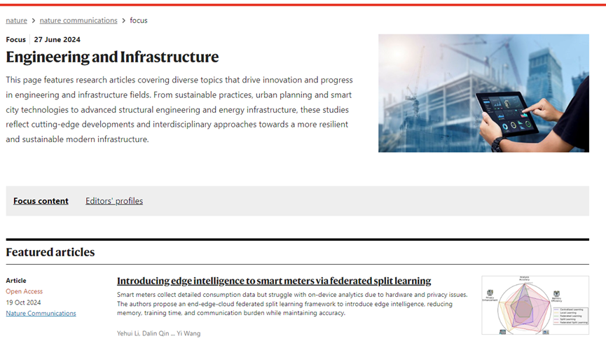 近日,國際知名學術期刊《Nature Communications》(圖1)在線刊登了香港大學王毅教授團隊與普林斯頓大學研究團隊的最新成果——通過聯邦分割學習為智能電表引入邊緣智能(Introducing Edge Intelligence to Smart Meters via Federated Split Learning)。該論文同時被編輯推薦為工程與基礎設施領域前50篇最具亮點的精選論文(Editors’ Highlights pages aim to showcase the 50 best papers recently published in an area)(圖2)。