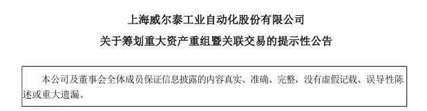 20241219日,上海威爾泰工業自動化股份有限公司(簡稱:威爾泰)發布《關于籌劃重大資產重組暨關聯交易的提示性公告》。