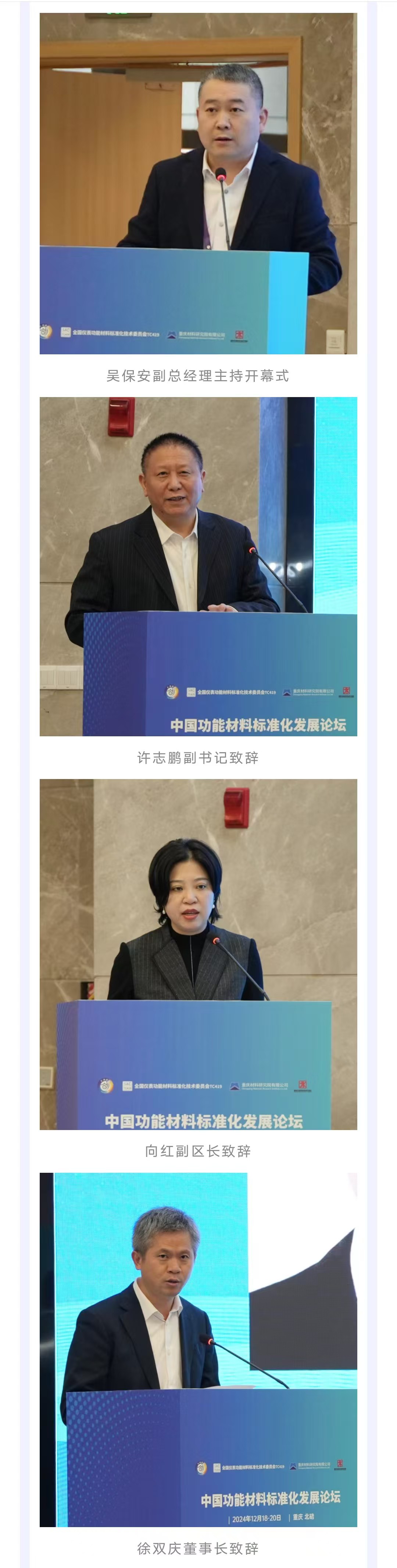 開幕式由重材院黨委委員、副總經理(主持經理層工作)吳保安主持。許志鵬副書記、向紅副區長、徐雙慶董事長分別致辭并指出功能材料是支撐國民經濟發展的基礎性產業,是產業基礎再造的主力軍和工業綠色發展的主戰場。標準在功能材料工業發展中發揮著基礎性、引領性作用。希望與會專家學者凝心聚力,積極建言獻策,不斷開創功能材料標準化工作新局面,為發展新質生產力,實現功能材料行業高質量發展貢獻力量。