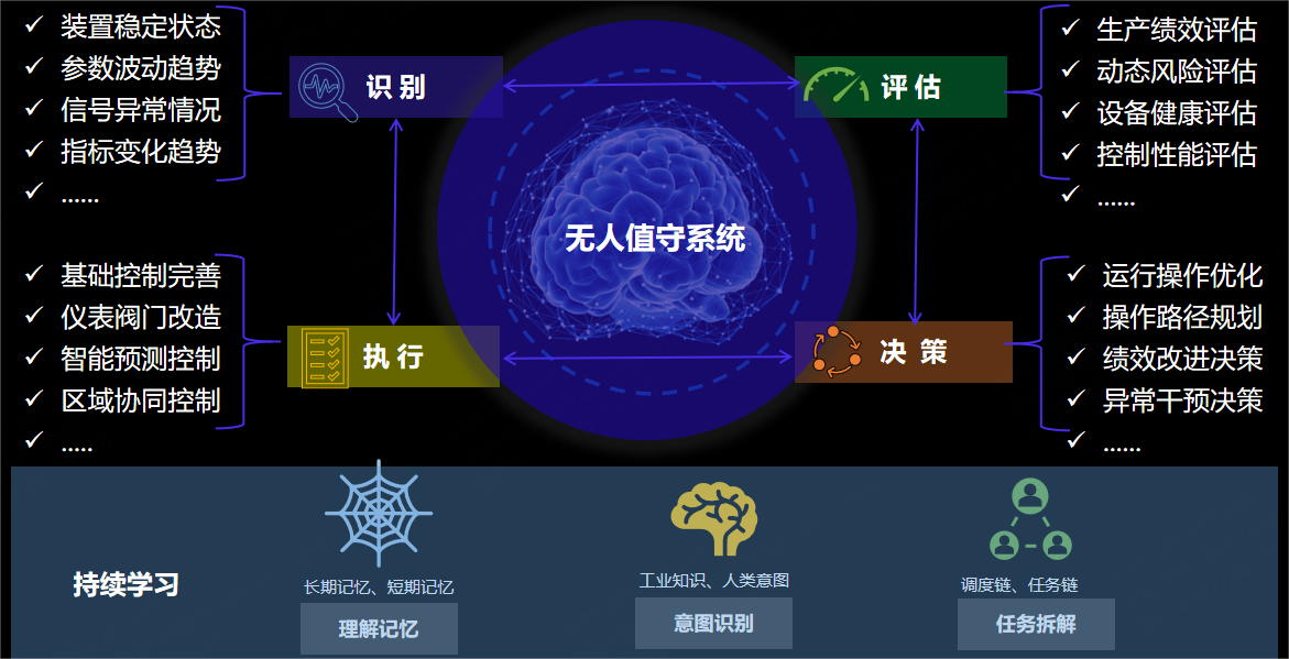 “無人”值守能夠將企業較為稀缺的人力資源從復雜、繁瑣、重復的操作活動中解放出來,提升裝置運行水平、安全水平和效益,減少非計劃停工,對裝置的長周期、高效自主運行具有深遠意義,是化工裝置“安、穩、長、滿、優”高度自主運行的集中體現。區別于傳統的“黑屏操作”,“無人”值守的關鍵在于裝置系統能夠具備“識別-評估-決策-執行”的自主能力,實現對外部的需求或干擾進行自主響應,同時又可對系統內部要素的完整性、健康性、穩定性進行自我管理,最終達到無需人工干預、實現無人值守的目標。