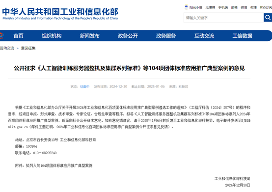 工信部12月30日發(fā)布消息,根據(jù)《工業(yè)和信息化部辦公廳關(guān)于開展2024年工業(yè)和信息化百項團體標準應用推廣典型案例遴選工作的通知》(工信廳科函〔2024〕257號)的程序和要求,經(jīng)項目申報、形式審查、技術(shù)審查、專家論證、合規(guī)性審查等程序,擬將《人工智能訓練服務器整機及集群系列標準》等104項團體標準列入2024年百項團體標準應用推廣典型案例,現(xiàn)面向社會公開征求意見。