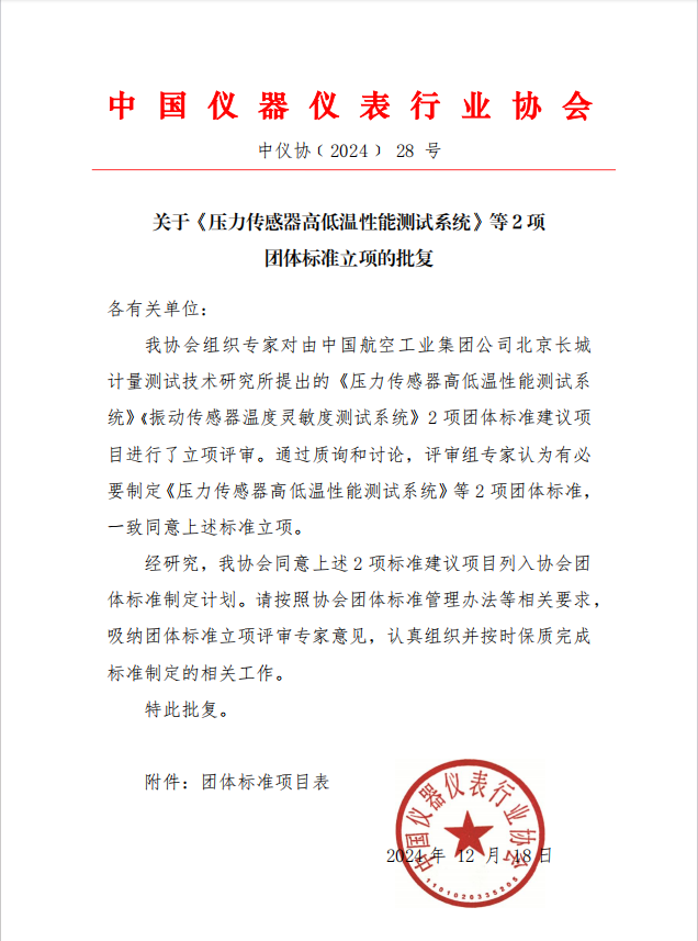 根據《中國儀器儀表行業協會團體標準管理辦法》的規定,經審查,對由中國航空工業集團公司北京長城計量測試技術研究所(簡稱“304)提出的《壓力傳感器高低溫性能測試系統》 《振動傳感器高低溫性能測試系統》2項團體標準進行立項(標準編號和標準名稱見公告附件),特此公告。