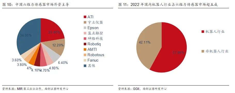 據(jù)此前MIR睿工業(yè)《2024中國六維力傳感器市場報告》顯示,2023年中國六維力傳感器出貨量不足萬臺,出貨規(guī)模剛剛突破2億元,主要應(yīng)用于機器人、工業(yè)自動化和汽車等行業(yè),其市場集中度較高,TOP10廠商占接近70%份額,國產(chǎn)宇立儀器、藍點觸控、坤維科技位列市場份額第二、四、五位。中國六維力傳感器市場仍為外資主導(dǎo)。