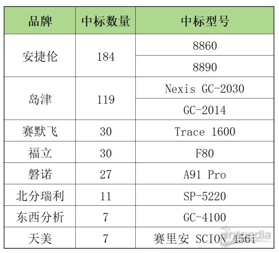 國產(chǎn)品牌中,福立的F80和磐諾的A91 Pro是中標(biāo)數(shù)量較多的型號(hào),尤其是在環(huán)境監(jiān)測、食品藥品檢測等領(lǐng)域,國產(chǎn)品牌的性價(jià)比優(yōu)勢得到了充分體現(xiàn)。此外,北分瑞利SP-5220系列高端氣相色譜儀、天美賽里安 SCION 456i和東西分析GC-4100也表現(xiàn)出了不俗的成績。