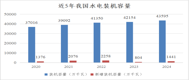 水電作為常規(guī)電力中唯一的可再生能源,2024年總體呈現(xiàn)出穩(wěn)定增長的發(fā)展趨勢,并且在全球范圍內(nèi)保持領(lǐng)先地位。截至當年底,我國水電總裝機容量達到4.36億千瓦,占我國電力總裝機的13.02%,較2023年新增裝機容量1378萬千瓦,同比增長3.2%,其中,常規(guī)水電裝機規(guī)模3.77億千瓦、同比增加625萬千瓦;抽水蓄能裝機規(guī)模5869萬千瓦、同比增加753萬千瓦。全年水電發(fā)電量14239億千瓦時,占發(fā)電總量的13.53%,僅次于火電,排在第2位;規(guī)模以上水電年平均利用小時數(shù)為3349小時。在雙碳目標和新能源快速發(fā)展的大背景下,水電以其穩(wěn)定、清潔的特點,成為我國清潔能源供應(yīng)的可靠保證。