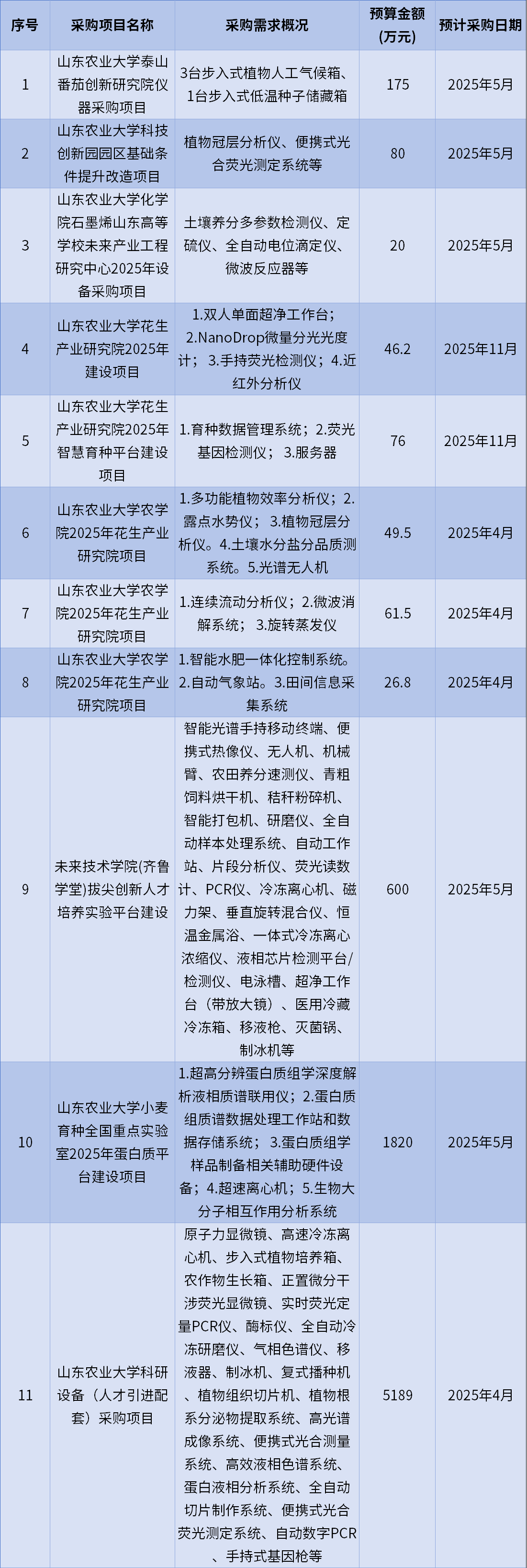 山東農(nóng)業(yè)大學(xué)儀器采購意向匯總,本次匯總含17項(xiàng)采購專項(xiàng),預(yù)計(jì)采購時(shí)間在2025年4月、5月、11月,預(yù)算金額共計(jì)9331.8382萬元。