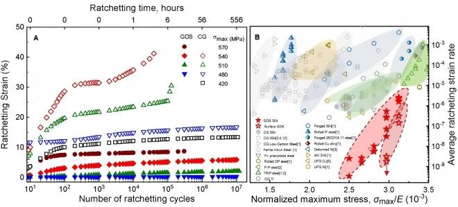 疲勞是金屬材料主要的失效形式之一,在承受循環(huán)應(yīng)力或交變載荷的工程結(jié)構(gòu)中表現(xiàn)尤為顯著。疲勞失效通常發(fā)生在遠(yuǎn)低于材料屈服強(qiáng)度的應(yīng)力水平下,具有突發(fā)性和隱蔽性,對工程結(jié)構(gòu)安全構(gòu)成了嚴(yán)重威脅。其中,循環(huán)蠕變(棘輪效應(yīng))是一種嚴(yán)重的疲勞變形機(jī)制,表現(xiàn)為非對稱應(yīng)力循環(huán)與非零平均應(yīng)力作用下循環(huán)塑性應(yīng)變的單向累積,最終導(dǎo)致不可逆轉(zhuǎn)的結(jié)構(gòu)破壞。傳統(tǒng)高強(qiáng)度材料常伴隨循環(huán)軟化和應(yīng)變局域化現(xiàn)象,二者耦合加劇棘輪效應(yīng),加速構(gòu)件過早疲勞失效。提高高強(qiáng)度金屬材料的抗循環(huán)蠕變損傷能力,已成為材料工程領(lǐng)域亟待解決的重大技術(shù)挑戰(zhàn)。
