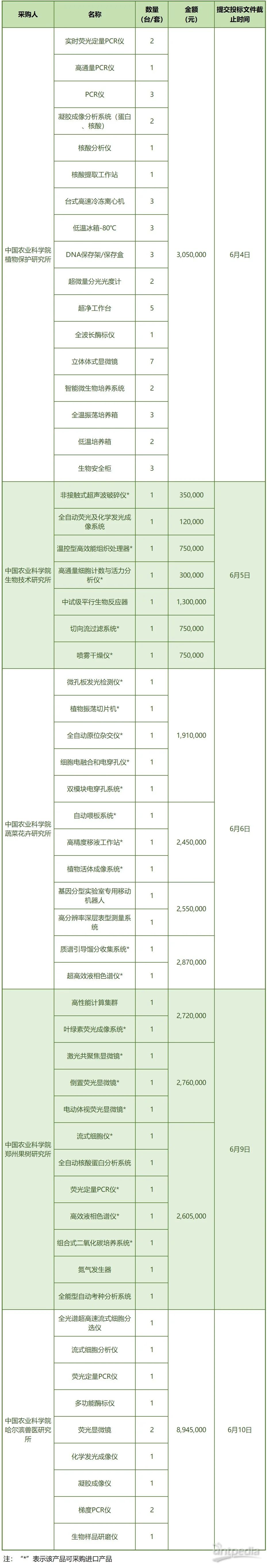 近日,中國農(nóng)業(yè)科學(xué)院旗下多個研究所發(fā)布了儀器設(shè)備招標公告,包括果樹瓜類研究、人獸共患病病原研究、農(nóng)業(yè)微生物智能設(shè)計與合成、農(nóng)業(yè)生物安全科學(xué)等多個方向,預(yù)算總金額3418萬元,涵蓋多種先進的科研儀器設(shè)備,如PCR儀、核酸分析儀、超高效液相色譜儀、激光共聚焦顯微鏡等,其中有部分可采購進口產(chǎn)品。