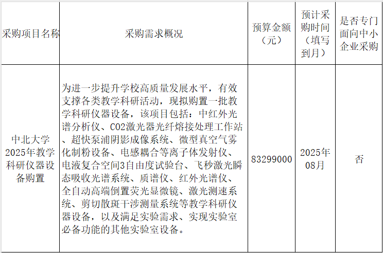為便于供應商及時了解政府采購信息,根據《財政部關于開展政府采購意向公開工作的通知》(財庫〔2020〕10號)等有關規定,現將中北大學2025年7月至8月第二批采購意向公開如下: