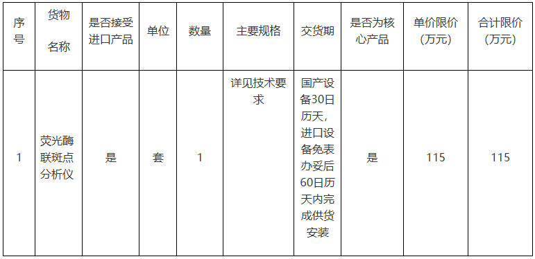 華中農業大學微生物資源庫建設項目第七批(熒光酶聯斑點分析儀) 招標項目的潛在投標人應在武漢市洪山區徐東大街徐東嘉園B座2801獲取招標文件,并于2025年07月30日 09點30分(北京時間)前遞交投標文件。