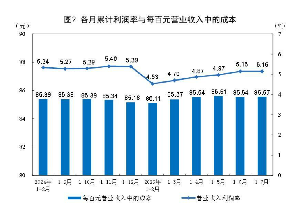 1—7月份,規模以上工業企業實現營業收入78.07萬億元,同比增長2.3%;發生營業成本66.80萬億元,增長2.5%;營業收入利潤率為5.15%,同比下降0.21個百分點。