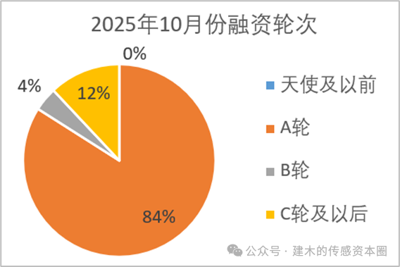 2025年10月份的25起融資事件中,84%的融資落在了A輪階段,沒有出現(xiàn)天使輪融資,B輪及以后階段的融資大幅減少。