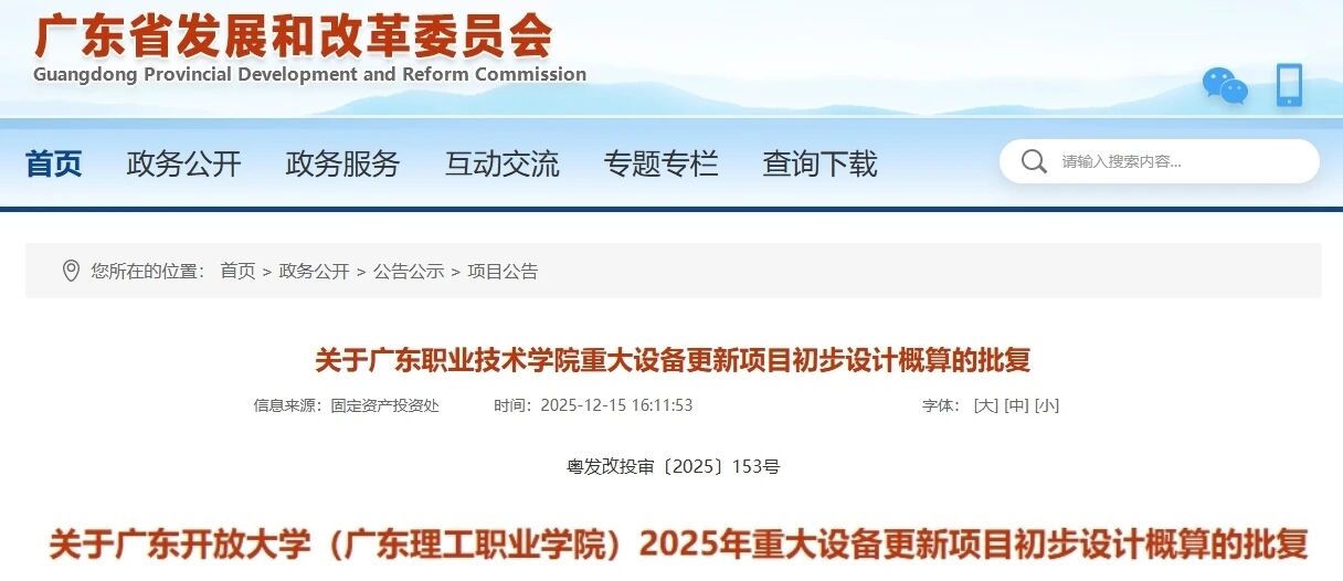 12月15日,廣東省發(fā)展和改革委員會連續(xù)發(fā)布兩項(xiàng)批復(fù)——“關(guān)于廣東職業(yè)技術(shù)學(xué)院重大設(shè)備更新項(xiàng)目初步設(shè)計(jì)概算的批復(fù)”以及“關(guān)于廣東開放大學(xué)(廣東理工職業(yè)學(xué)院)2025年重大設(shè)備更新項(xiàng)目初步設(shè)計(jì)概算的批復(fù)”。根據(jù)批復(fù),兩所院校擬更新購置共142臺(套)教學(xué)科研儀器設(shè)備,總投資14930萬元。