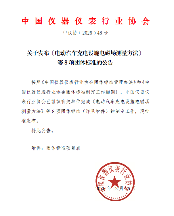 關(guān)于發(fā)布《電動(dòng)汽車充電設(shè)施電磁場(chǎng)測(cè)量方法》等8項(xiàng)團(tuán)