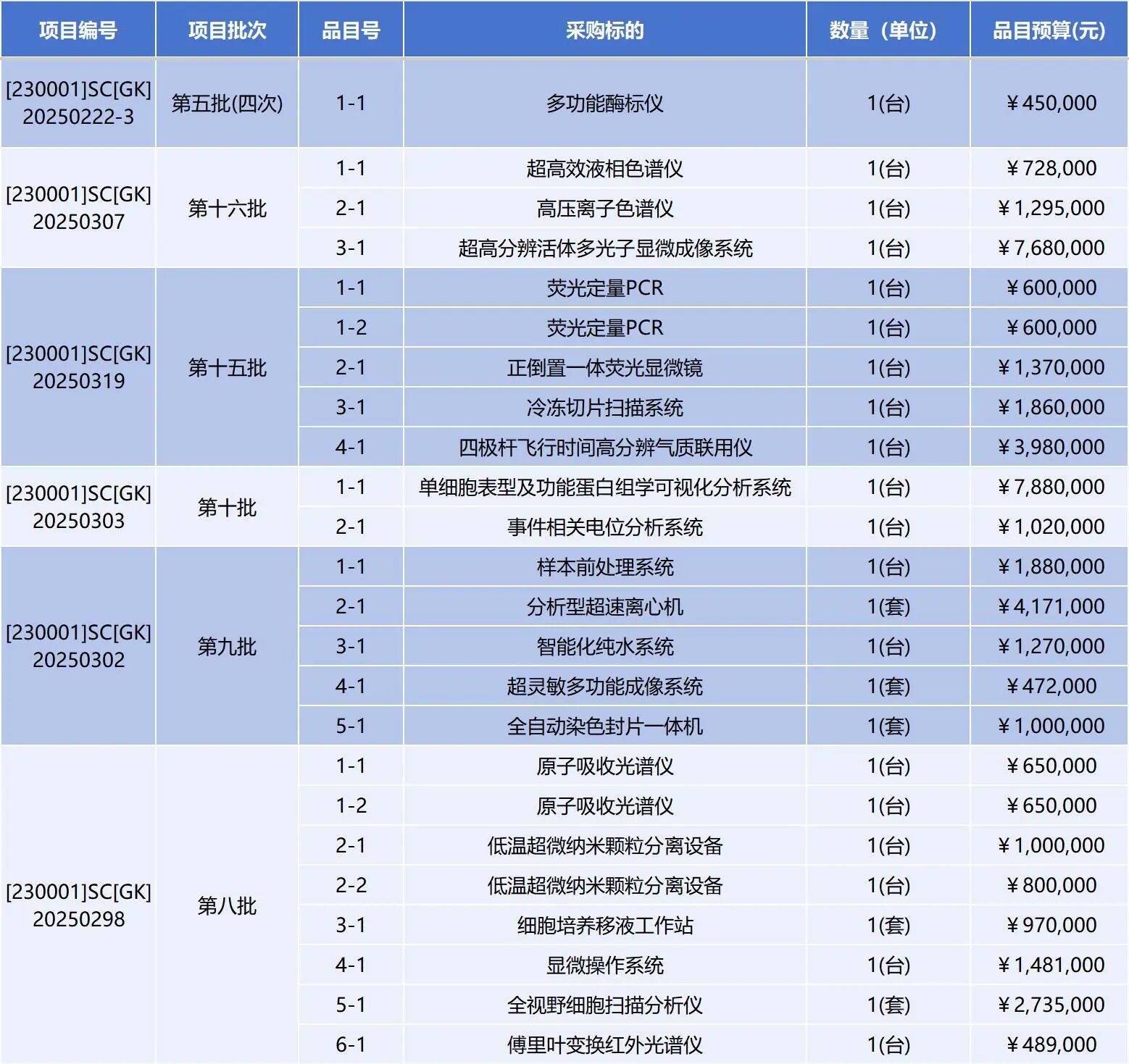 據(jù)統(tǒng)計,本次計劃采購的儀器設備總預計招標金額超過8200萬元,涵蓋四極桿飛行時間高分辨氣質(zhì)聯(lián)用儀、高效液相色譜儀、研究級倒置熒光顯微鏡、倒置多功能熒光成像系統(tǒng)、熒光定量PCR儀、高壓離子色譜儀、多功能酶標儀、傅里葉變換紅外光譜儀、原子吸收光譜儀、超靈敏化學發(fā)光成像儀、超高頻高分辨率小動物超聲成像系統(tǒng)、小動物活體三維成像系統(tǒng)、超靈敏多功能成像系統(tǒng)、單細胞表型及功能蛋白組學可視化分析系統(tǒng)等共計40項高端科研設備。
