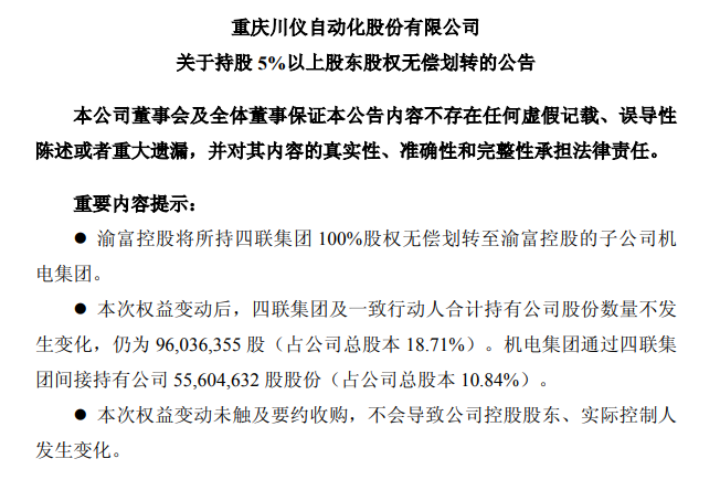 1月30日,川儀股份(603100)公告,渝富控股將所持四聯(lián)集團100%股權(quán)無償劃轉(zhuǎn)至渝富控股的子公司機電集團。本次權(quán)益變動后,四聯(lián)集團及一致行動人合計持有公司股份數(shù)量不發(fā)生變化,仍為96,036,355股(占公司總股本18.71%)。機電集團通過四聯(lián)集團間接持有公司55,604,632 股股份(占公司總股本10.84%)。