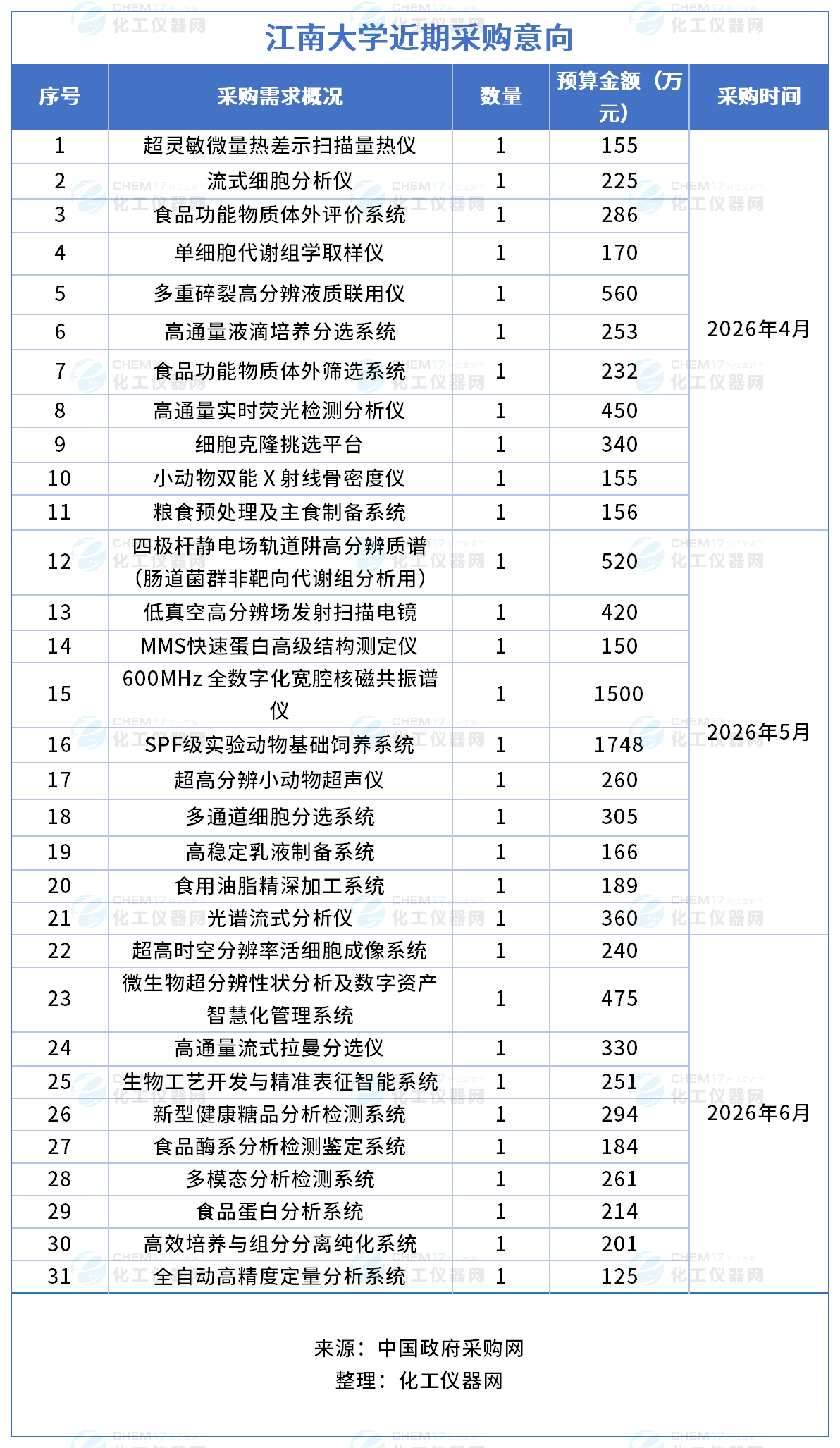 近期,江南大學發布多項儀器采購意向,采購預算金額11175萬元,涉及儀器設備包括超靈敏微量熱差示掃描量熱儀、流式細胞分析儀、食品功能物質體外評價系統、單細胞代謝組學取樣儀、多重碎裂高分辨液質聯用儀、高通量液滴培養分選系統、食品功能物質體外篩選系統等。預計采購時間2026年4月-6月。