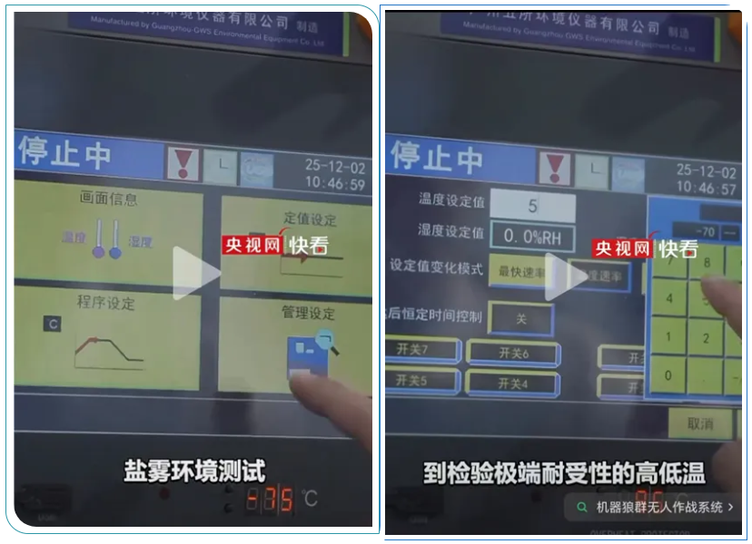 近日,央視網發布《100只整裝待發!量產機器狼“-20℃極寒測試”現場曝光》報道,廣五所公司自主研發的可靠性環境試驗設備全程參與本次測試,為機器狼的極端環境耐受性測試提供了精準、穩定的環境模擬保障。