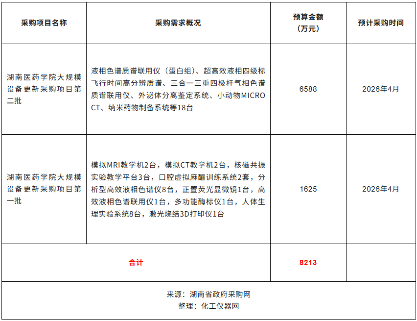 近日,湖南醫(yī)藥學院公布2026年2季度采購意向,計劃采購液相色譜質譜聯(lián)用儀、外泌體分離鑒定系統(tǒng)、核磁共振實驗教學平臺、分析型高效液相色譜儀、正置熒光顯微鏡、多功能酶標儀等47臺儀器設備,預算總金額8213萬元。預計采購時間2026年4月。