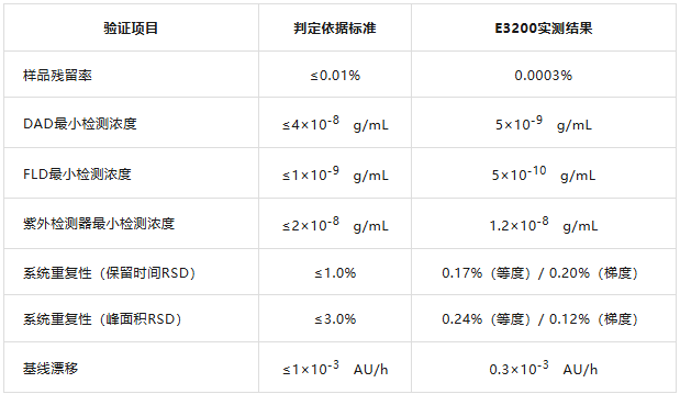 從數(shù)據(jù)可見,E3200 HPLC在各項關(guān)鍵指標上均優(yōu)于標準要求,尤其在最小檢測濃度、殘留率等核心性能上表現(xiàn)突出。