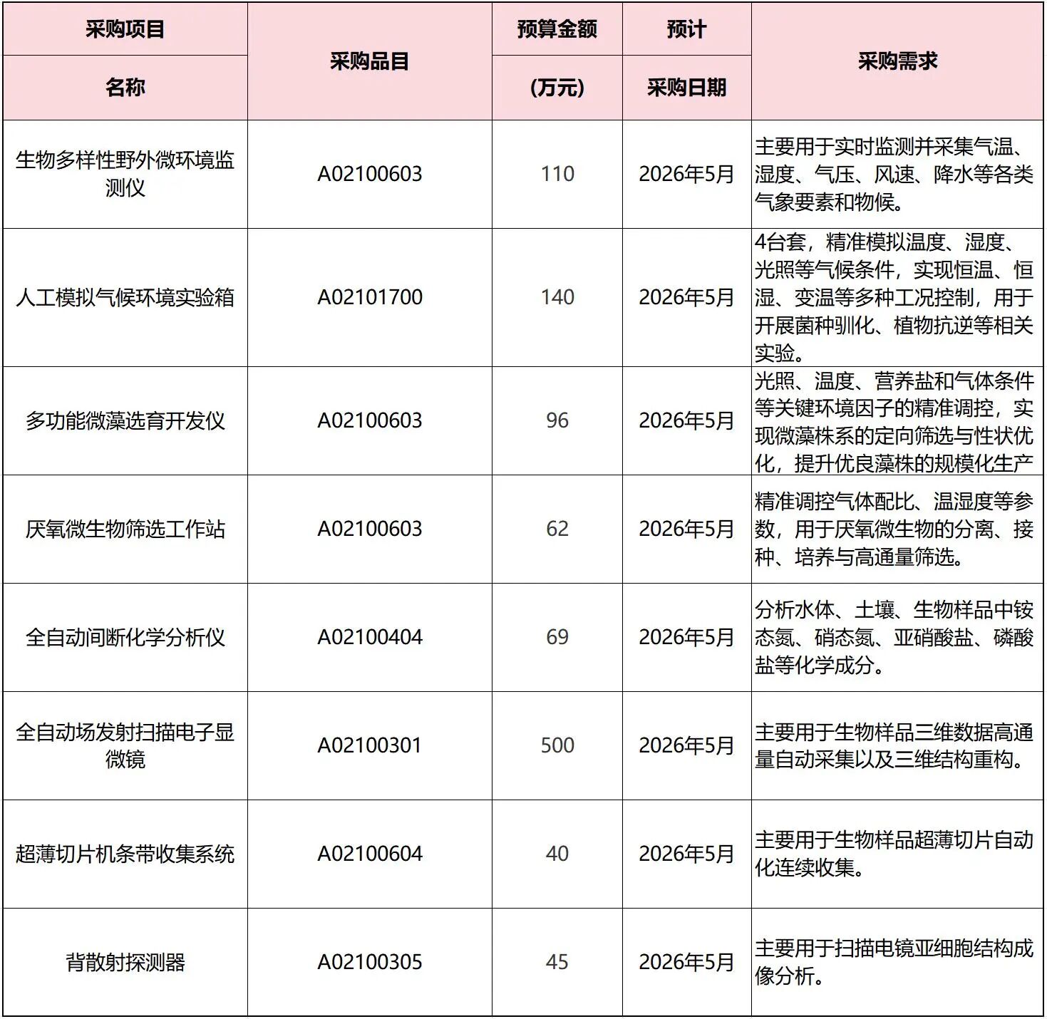 近日,中國科學院昆明植物研究所發布2026年5至6月政府采購意向,集中采購一批重大科研儀器設備,總預算金額達1062萬元。