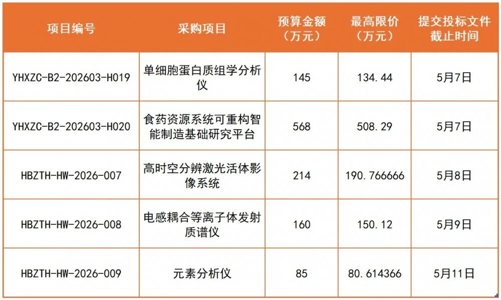 近日,武漢輕工大學生科院大型儀器設備平臺設備更新項目項目已正式啟動公開招標。本次采購涵蓋單細胞蛋白質組學分析儀、食藥資源系統可重構智能制造基礎研究平臺、高時空分辨激光活體影像系統、電感耦合等離子體發射質譜儀及元素分析儀等多套高端科研設備,整體預算金額達1172萬元,項目最早投標截止時間為57日。