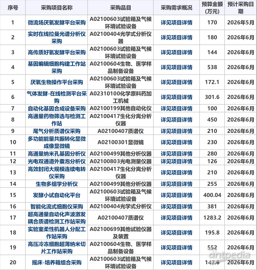 近日,大連理工大學發(fā)布 2026 年5至6月政府采購意向,涉及 20 個項目,總預算達 6326.34 萬元,預計采購日期集中于 2026 年 5-6 月。本次采購涵蓋微流場厭氧發(fā)酵平臺、實時在線拉曼光譜分析儀、基因編輯細胞構(gòu)建工作站、超高通量自動化聲波激發(fā)耦合質(zhì)譜檢測工作站等設(shè)備,涉及光學分析、質(zhì)譜檢測、樣品制備、生化分離等多個品類。