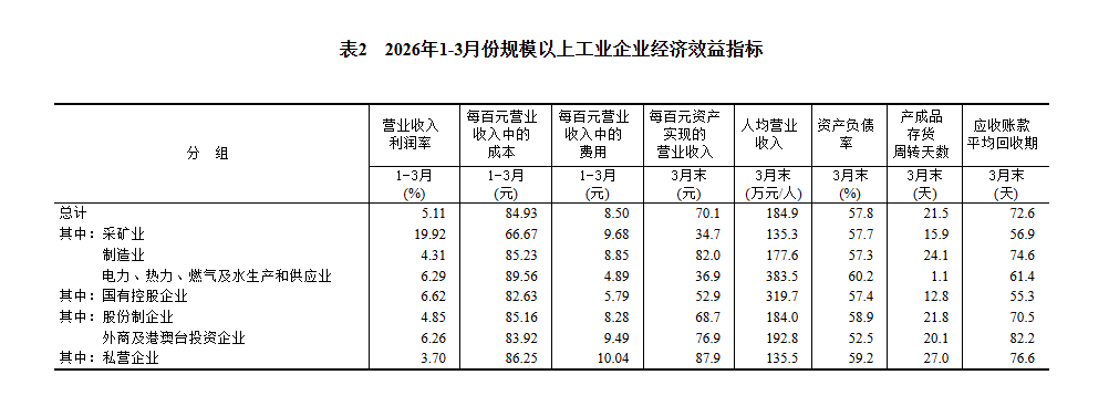 3月末,規模以上工業企業每百元資產實現的營業收入為70.1元,同比減少0.2元;人均營業收入為184.9萬元,同比增加10.5萬元;產成品存貨周轉天數為21.5天,同比增加0.3天;應收賬款平均回收期為72.6天,同比增加1.3天。