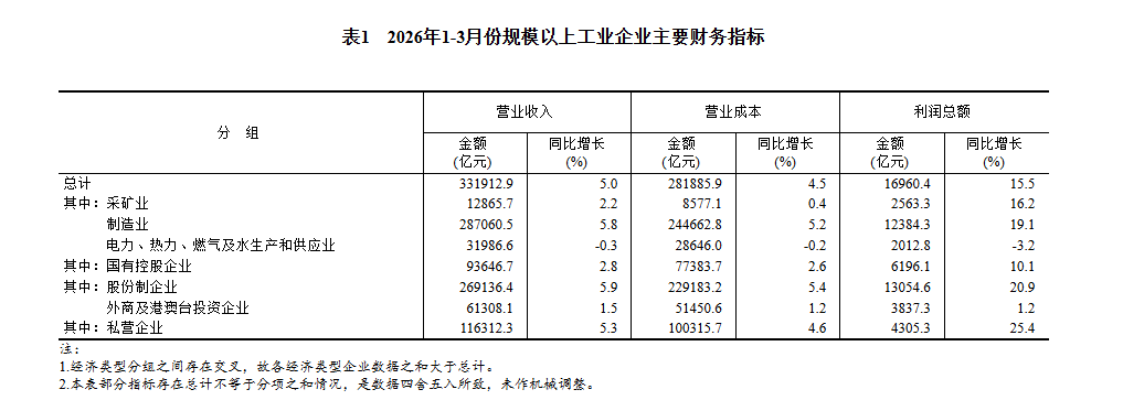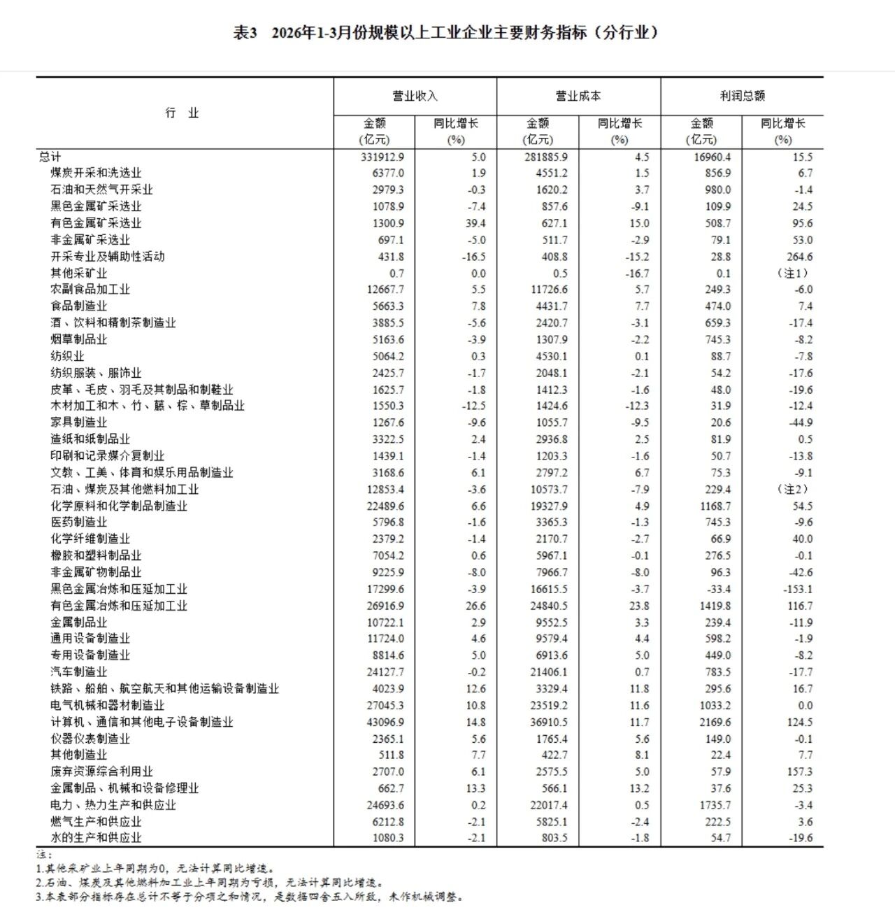 13月份,全國規模以上工業企業實現利潤總額16960.4億元,同比增長15.5%(按可比口徑計算,詳見附注二)。